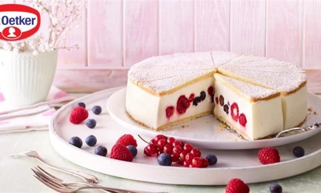 Placez le fond de gâteau prédécoupé dans le moule à charnière. Versez la garniture dessus. Couvrez avec le deuxième fond de gâteau et laissez figer au réfrigérateur pendant au moins 3 heures.