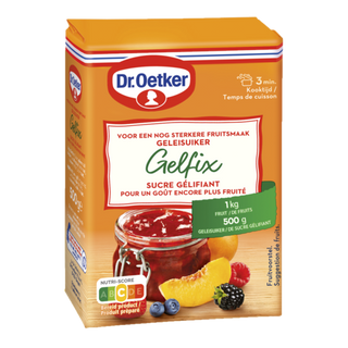 Dr. Oetker Gelfix Geleisuiker is een mengeling van suiker en pectine uit appelen en citrusvruchten. Bij het afkoelen zorgt de pectine voor de stolling en geeft deze de confituur of gelei een mooie stevigheid.