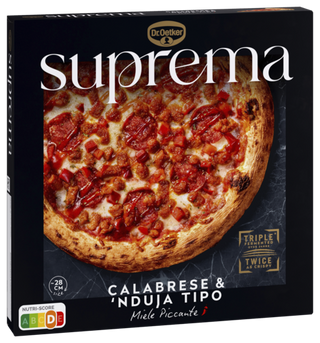De Pizza Suprema van Dr. Oetker is een echte premium diepvriespizza en biedt een buitengewone pizzakwaliteit. Jarenlange pizza-expertise, een reis van onze deegmeesters naar Napels en experimenten met onze Suprema-formule hebben geleid tot een pizzadeeg dat een uniek 3-fasen fermentatieproces ondergaat. En omdat tijd het geheime ingrediënt is, zorgt het 24 uur durende fermentatieproces voor een heerlijk pure smaakbeleving en een bijzondere textuur: luchtig binnenin en vanbuiten extra knapperig. We verfijnen onze premium pizzabodem met een tomatenpassata van zonovergoten tomaten uit de Italiaanse regio Emilia-Romagna en beleggen deze alleen met geselecteerde ingrediënten van hoge kwaliteit.