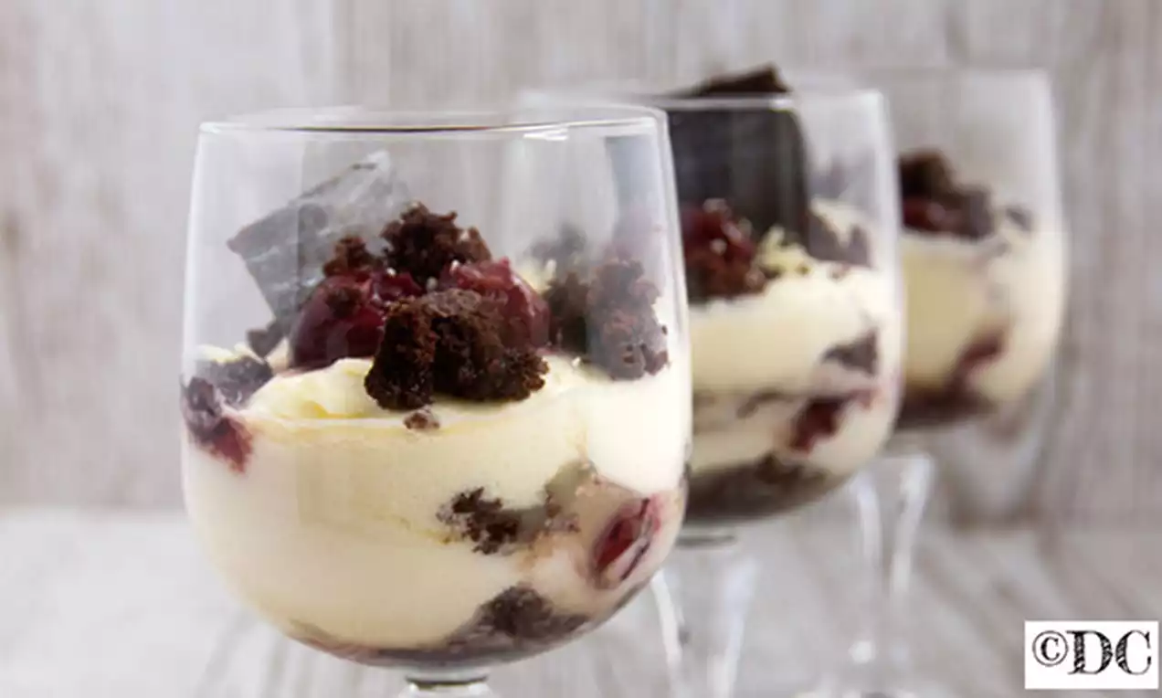 Giet de krieken op sap af, maar hou het sap bij! Meng 100 ml van het sap met 100 ml kirsch. Besprenkel elk stukje van de brownie met het krischmengsel.